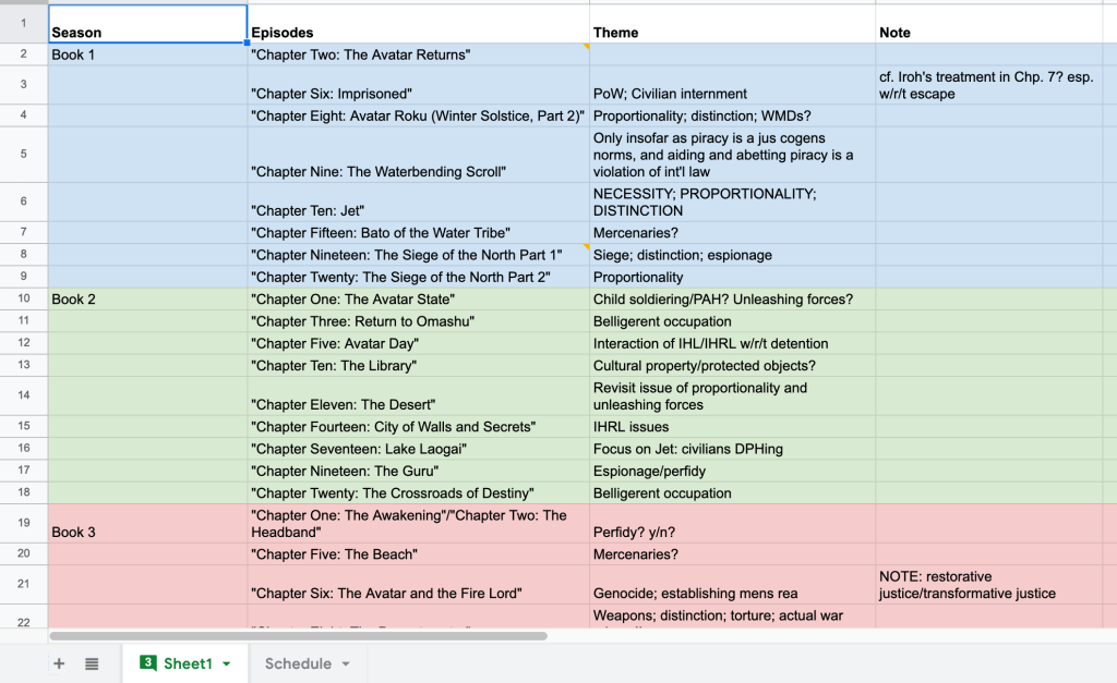 It’s a new year, and I’m between semesters, which means I need a preoccupation (in addition to two part-time jobs and several video games). Of the usual millennial lock-down hobbies, I had chosen TikTok, and one of the TikToks I came across – genuinely, a testament to the algorithm – was a list of war crimes committed in Avatar: the Last Airbender (ATLA). I was immediately disappointed; I mean, TikTok doesn’t necessarily lend itself to a detailed application of the Geneva Conventions but still! I wanted a more robust and nuanced analysis. So, coming off a semester studying international humanitarian law (IHL), I decided: why not make this a project for myself? I gauged some interest using Instagram, talked the idea through with my husband, and drew up a spreadsheet.